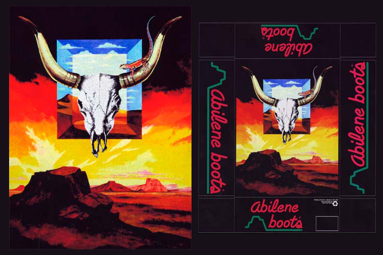 This is the lid to a box that holds a pair of boots. The dramatic colors of this image was the biggest challenge. Due to the fact that this was flexographic printing, I had to compensate for low resolution and poor registration to ensure this would print properly. This involved many hours of touch-up work in Adobe Photoshop, per channel, to ensure proper trapping, proper dot gain, and still achieve an aestetically pleasing image. Printing process: Flexographic